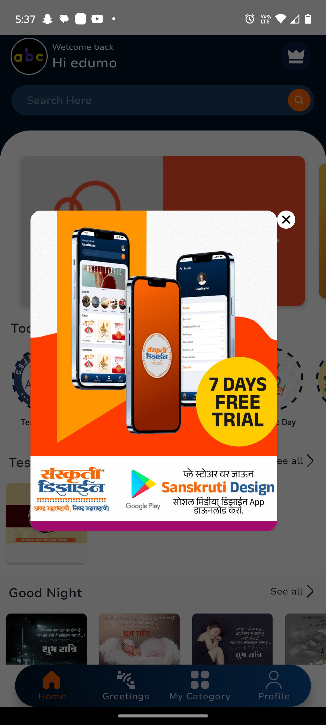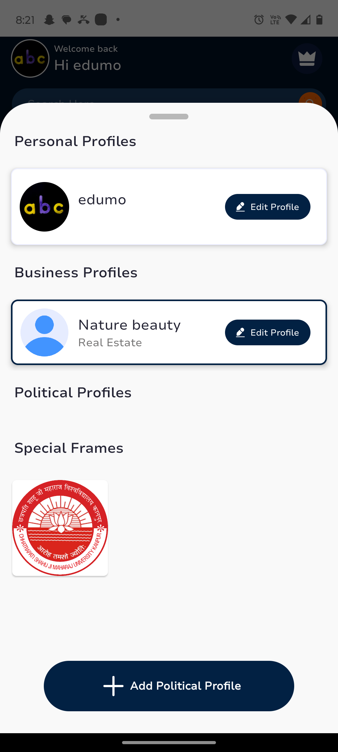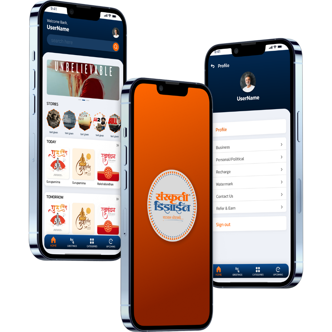 Sanskruti app allows users get premade design posts and they can create their own profiles, where they can add their content and after they select their desired post they get to pick which profile they want to have, they are given 4 options, which they can setup, one is business profile, political profile and a desired frame uploaded by the admin just for them..